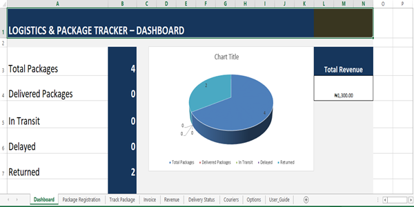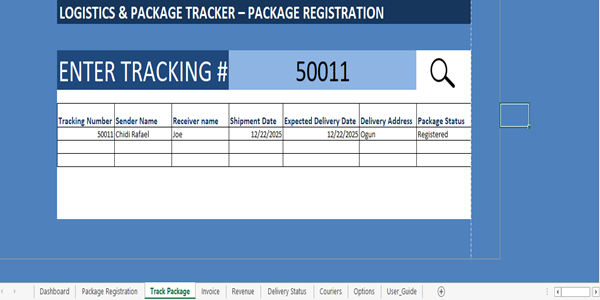 The template also allows you to track the real-time status of packages from registration to delivery, including in-transit, delivered, delayed, or returned shipments. Built-in tracking and lookup features make it simple to check package progress using a tracking number, while automated calculations help you monitor delivery performance and business activities. Revenue is calculated automatically per shipment, giving you instant visibility into daily, weekly, and monthly earnings.
