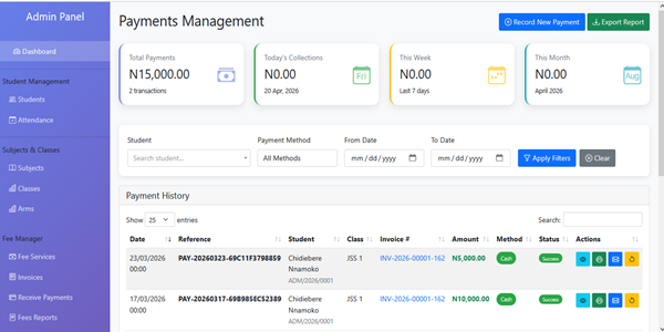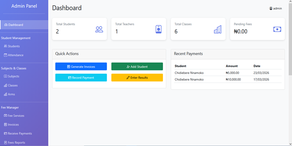 The Ultimate School Management System is a comprehensive, web-based platform that streamlines all administrative, academic, and financial operations for educational institutions. Built with PHP, MySQL, Bootstrap, and JavaScript, this all-in-one solution features four distinct user portals (Admin, Accountant, Teacher, and Student) with role-based access control. The system handles everything from student enrollment and fee collection to result processing, attendance tracking, and professional report card generation. With Paystack integration for online payments, automated invoice generation, and export capabilities to Excel and PDF, this system eliminates manual paperwork, reduces errors, and provides real-time insights into your school's operations. Whether you're a small nursery or a large secondary school, this scalable solution adapts to your needs with support for class arms, flexible assessment configurations (1-5 CA components), and customizable grading scales.